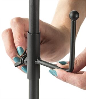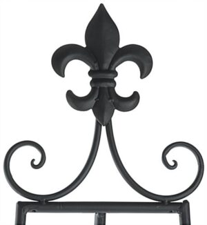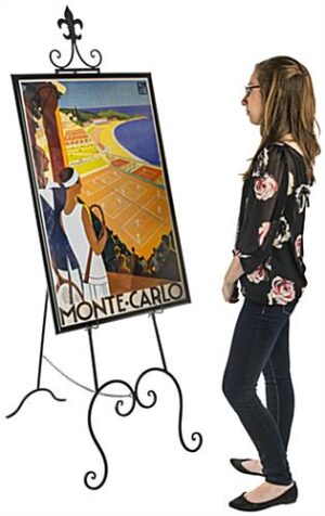 This adjustable decorative easel provides a large floor standing art display for a studio, gallery night, keynote presentation announcement, and even an event poster. Offering a heavy duty yet lightweight frame, these holders collapse together, allowing for an easy transport throughout an exhibit while also consuming minimal space when storing. Fabricated with a matte black powder coated finish, this wrought iron easel is designed to withstand years of use. A delicate Fleur-de-Lis topper adds a stylish flare, and offers a charming accent to any display piece placed upon the height-modifiable hooks. The metal hooks range in positioning on the frame from 15” – 56”, providing showcasing options which allow users to rearrange each easel to best suit the size of art being presented to an audience. Equipped with a base safety chain, the floor standing holders are well suited for indoor use and are less likely to shift while placed on exhibit. Utilize a delicately designed, yet sturdily constructed stand at your next event or within your establishment to make an impression without distracting from the items placed upon it!