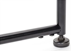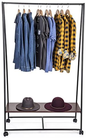 Solve your storage problems with this pipe a-frame clothes rack with wood shelf. A metal rustic design adds a modern style to your retail establishment or home. The wheeled a-frame clothes rack with wood shelf features two lockable casters that allow both mobility and stability. A single store rail keeps garments from resting on the floor while the sill provides a display area for accessories. Add a modern yet rustic touch to your home or retail shop with this metal teepee design that combines form and function. The store rail on this a-frame clothes rack is ideal for hanging garments or storing accessories for extra space when you need it most.