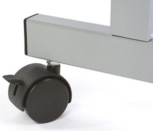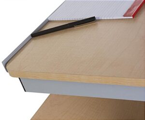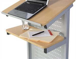 This laptop podium on wheels makes speaking in front of colleagues and students easy! Portable, this mobile cart has four locking casters secured to the bottom of the silver frame. Easily move this rolling podium to different conference rooms, classrooms, or offices for a great multimedia experience. The maple tabletop of the mobile cart features a safety lip that keeps papers and computers from falling off while in transit on the move or secured in place. Also, the surface of this podium is tilted slightly for easy reading. Under the tabletop of the rolling cart is an extra shelf that the audience cannot see which also provides speakers a space to keep extra computer accessories and notes while the portable lectern is in use.