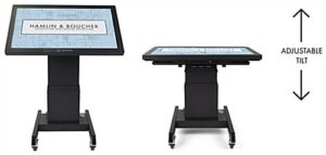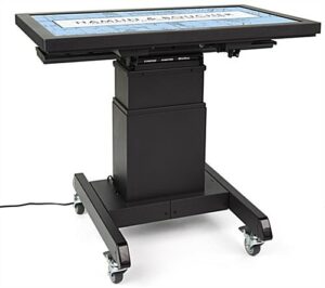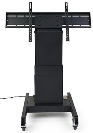 Our tilting mobile flat panel stand is a highly versatile display solution that provides accessible, comfortable, and ergonomically correct monitor positioning to enhance user experience and promote productivity. Designed to captivate the attention of passersby at any viewing angle, this motorized cart with wheels can showcase your media content on 43″ to 100″ touch or non-touch screens (sold separately). Unlike traditional TV carts, each mobile flat panel stand easily accommodates your organization’s display needs with motorized controls allowing for a variety of multiple position possibilities, from an upright stance to a floor standing kiosk to an interactive table setting. This rolling commercial monitor fixture can lean back to an impressive 90-degrees and smoothly adjust between 36″ to 62″ tall for maximum visibility of presentations, brand messaging, promotional advertising, and more. Suitable for high traffic areas such as hotels, retail stores, and corporate offices, this mobile flat panel stand with lift and tilt functionality is constructed of a heavy-duty steel frame with a black powder-coated finish meant to withstand years of use. Each rolling motorized cart has two locking and two non-locking caster wheels intended to move this TV display effortlessly between locations and conveniently lock into place for added stability when not in use. Pair this motorized monitor cart with coordinating touch or non-touch screens (sold separately) within your establishment for a custom showcase that will be sure to inspire collaboration, encourage interaction from guests, and elevate your advertising from any angle!