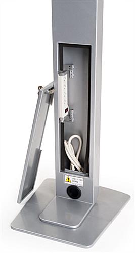 These iPad literature stands have a built-in pocket that holds magazines and other marketing material. The silver enclosure is designed specifically for public use and is a great advertising display for retail locations. To discourage tampering, the iPad literature stands come with a dual lock mechanism and are constructed to cover the home button. The unit is 54” tall and the mount can be positioned in either vertical or horizontal orientation. The back of the stand has a locking panel that covers the built-in power outlet. These iPad literature stands can accommodate several different iPad models.