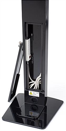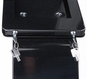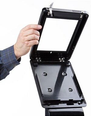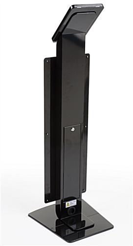 This poster iPad stand that has a poster display mounted on the front is the ideal modern advertising device. These enclosures are secure making them ideal for use in high traffic areas. This poster stand that includes a dual lock mechanism includes keys for the user to control who has access. Interactive advertising using tablets is a growing phenomenon in many businesses. This poster iPad stand that has a hidden power bar for charging allows users to hide wires for a sleek appearance. Tablet stands for public viewing can be used to draw in customers who will then have control over what they view with the interactive presentation. The dual locks on this iPad stand come with keys so the user can ensure that there is no tampering of presentations. The set height is tall enough for most customers to be able to comfortably interact with the contained tablet.