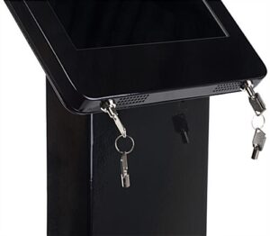Invigorate a lobby, convention booth, or store with an electronic kiosk such as this iPad Pro trade show stand. Built with high-quality aluminum, the lockable tablet pedestal is part of the exclusive Navigator Plus series. Ideal for 12.9″ tablets, this black trade show stand offers an interactive way to encourage customers and visitors to browse current sales, check-in for events, or sign-up for newsletters! To prevent tampering, the lockable enclosure requires a key to open while cables are run through the pedestal interior and plug into the included power strip. Although technology has become an integral aspect for many businesses, this electronic display incorporates a traditional signage design with the 12.5″w x 36.5″h poster panel. Graphics can be easily placed behind the acrylic overlay and installed on the pedestal itself for a high-quality promotion of sales, services, and slogans. Minimal assembly is required for this trade show stand and the enclosure can be easily switched to portrait or landscape orientation as needed.
