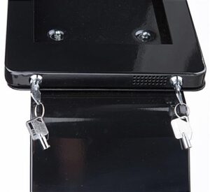 This iPad Pro stand meets ADA height and reach standards. The black aluminum kiosk, complete with cable management and a locking tablet enclosure, is ideal for any business that prioritizes accessibility and inclusion of all patrons. Your Apple 9.7” device will be secured within the iPad pro stand by two locks, putting you at ease. Each kiosk is keyed alike, making it convenient for your business to maintain and service multiple units. An Apple tablet can be displayed in either landscape or portrait orientation with the home button covered. This iPad Pro stand is a great way to demonstrate that you value accessibility with ADA height and reach standards incorporated in the design!