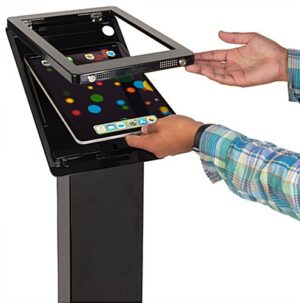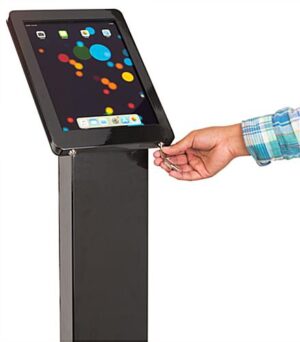 Meticulously designed, our black iPad Pro 12.9 stand tablet holder is a portable tool intended to help digitize your business, communicate important information, increase foot traffic or record visitor information. Its dual locking enclosure prevents theft and tampering of the tablet while it’s on display. The iPad Pro 12.9 stand features a 15″ x 15″ aluminum weighted base that keeps the metal structure from tipping over during use. A concealed built-in power supply with 4 outlets to accommodate other electronic devices your business needs. The internal base compartment also doubles as an enclosure cable organization system to keep the tablet holder area organized and clear of cords. This versatile and innovative iPad Pro 12.9 stand measures 54” in height and the angled top display enclosure creates an ergonomic position to make it inviting and comfortable for guests and employees.