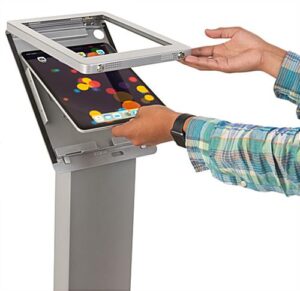 Our iPad Pro floor stand is an easy way to bring a digital kiosk to your lobby or office, creating the space you’ve always wanted to see. An anti-theft dual-locking enclosure, extra-strength aluminum construction, and silver gloss finish on an extremely sturdy base create the perfect tablet holder kiosk. The iPad Pro floor stand creates a unique, innovative, and exciting customer experience that generates leads and profit. An internal 4 outlet power supply and cable management compartment makes creating a professional secure and clean-looking tablet holder kiosk easier than ever. This electronic tablet booth is an immersive way to turn auto dealerships, trade shows, restaurants, bars, schools, stores and corporate offices into memorable experiences. Discover our iPad Pro floor stand and customize the experience to make it work for your business and your clients; we’ve designed this tablet kiosk to help create a marketing hub all in one place.