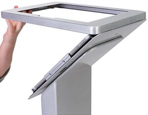 The pillar base Surface Pro floor stand enclosure is an ideal digital display kiosk for interacting with your guests at a retail establishment, trade show or expo. An aluminum build with two locks to secure your Microsoft tablet (not included) offers piece of mind that your device will not be tampered with.