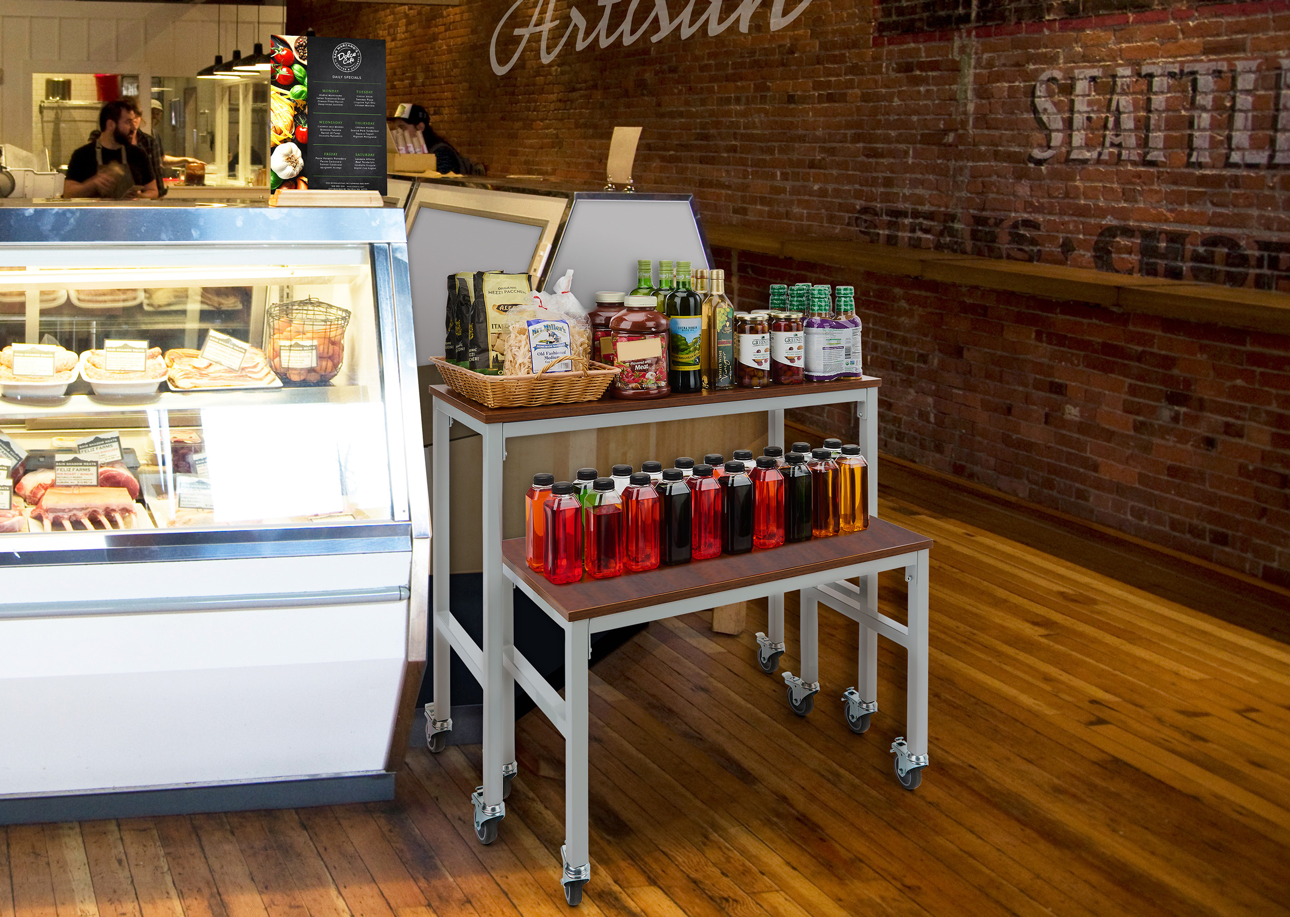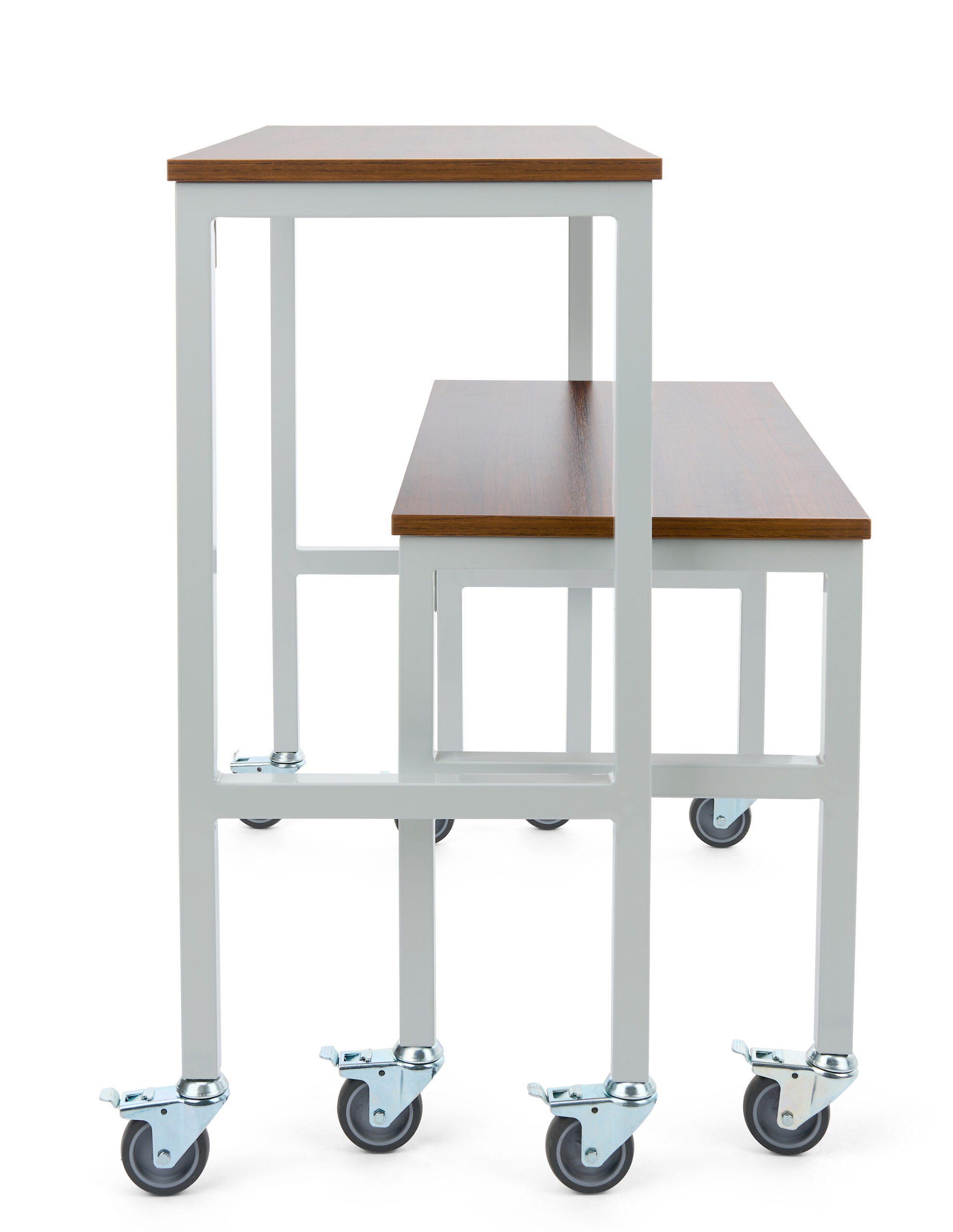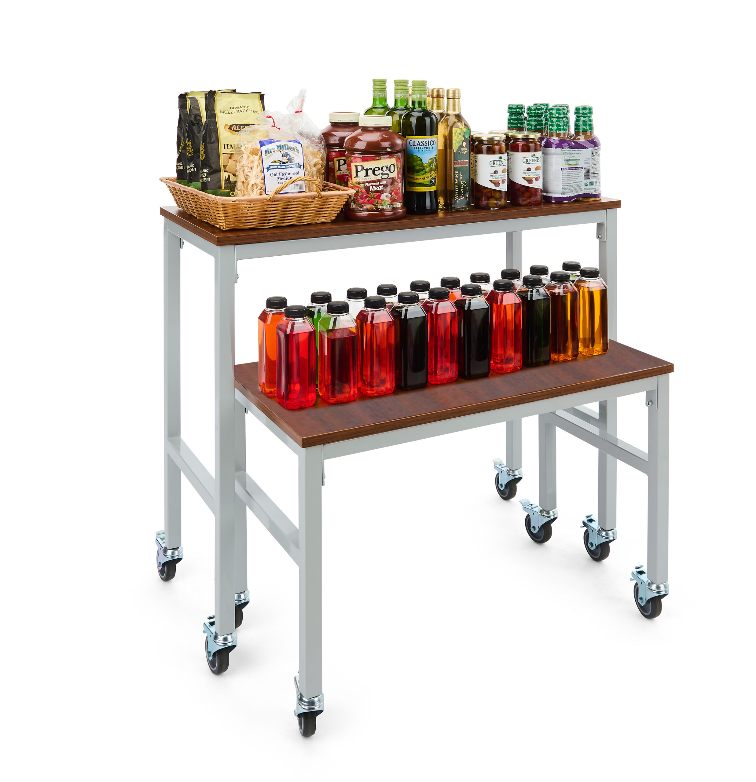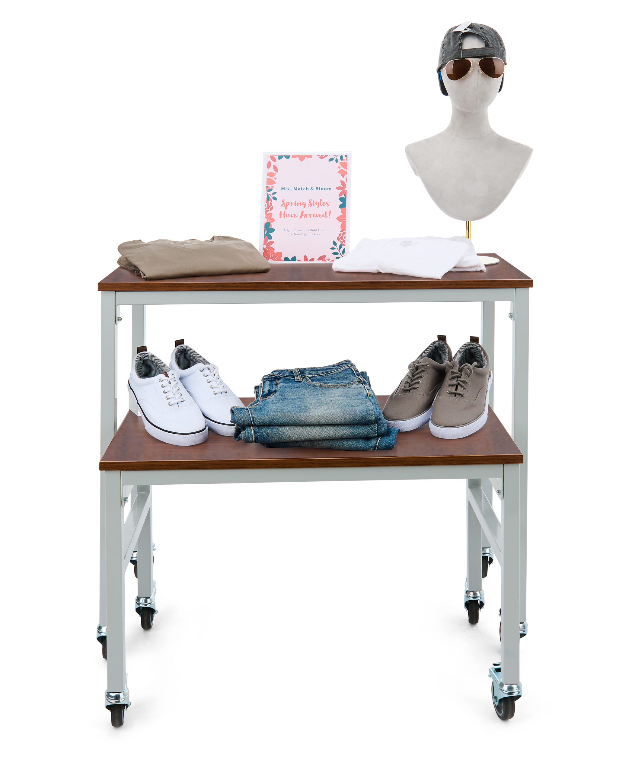 Introducing our versatile and convenient nesting table set on wheels! This contemporary piece is the perfect solution for maximizing your space while adding a touch of style to your retail setup. Our merchandising unit comes in a set of two different-sized tables perfect for displaying your unique products. The unit’s nesting design makes it simple to store by allowing one table to slide beneath the other. The innovative retail display features four locking caster wheels giving it easy mobility and flexibility for set up and rearrangement. This nesting table set was built using high-quality, FSC-certified laminated wood to ensure an eco-friendly environment . With a maximum weight capacity of 165 lbs per table, each table is expertly crafted from premium powder coated iron that is built to last. This mobile unit’s sleek and modern design adds a contemporary touch to any room, complementing a wide range of interior styles. Our nesting table set is incredibly functional and remarkably easy to maintain; the smooth surfaces can easily be wiped clean, making it ideal for busy retail spaces, home goods stores, and more.