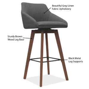 The new swivel stool from the Arbor Collection is a fun alternative to the ordinary stool. Coming in two upholstery options, including gray linen and black leather soft vinyl and boasting brown wood legs, this stool is also modern and sophisticated. Able to swivel 360 degrees, this stool also offers functionality.