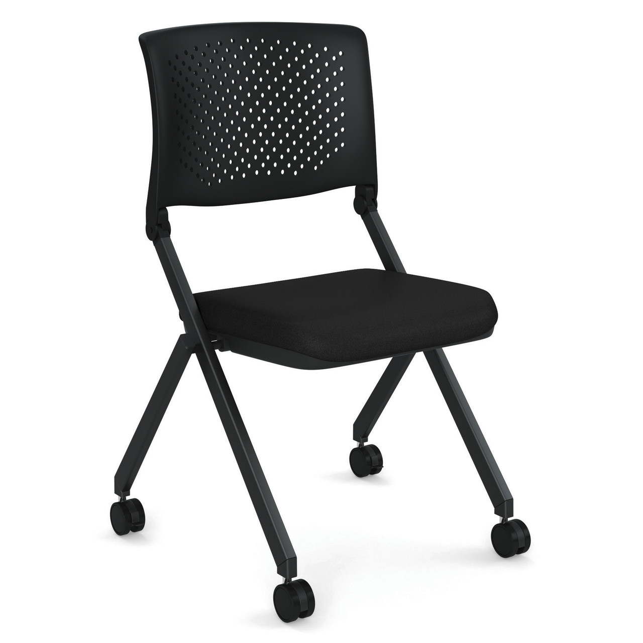 The Nesting Chair with Casters features chairs with durable black frames and fabric seats. The seats come in a variety of upholstery colors.