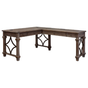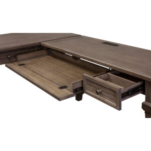 This right return open desk, coming in a weathered dove gray finish, with mottled hardware and diamond metal accents, is your solution for a unique desk with an antique feel. The desk comes with one pencil drawer and one utility drawer, while the return is equipped with one drop front keyboard pencil drawer, one utility drawer, two AC outlets, and three USB outlets, giving ample storage and working space. This desk and return must be sold as a set.