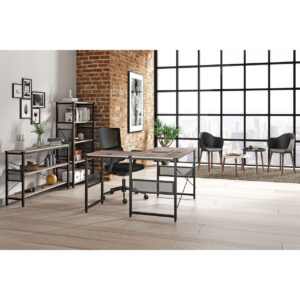Contemporary design meets rustic industrial style in this environmentally-friendly collection. With a superbly distressed, reclaimed aesthetic, this industrially-inspired collection is a perfect complement fo your office or home. The Melamine laminate top is 18mm thick. The metal around the frame edges show visible screw heads on the corners for a rustic, industrial look. The mesh panel accents provide stability and an urban feel. GreenGuard Certified and Carb2 Compliant and a Limited Lifetime Warranty.