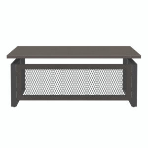- A 1⅝” thick work surface floats effortlessly above sleek steel squares with three points of contact at each end of the desk