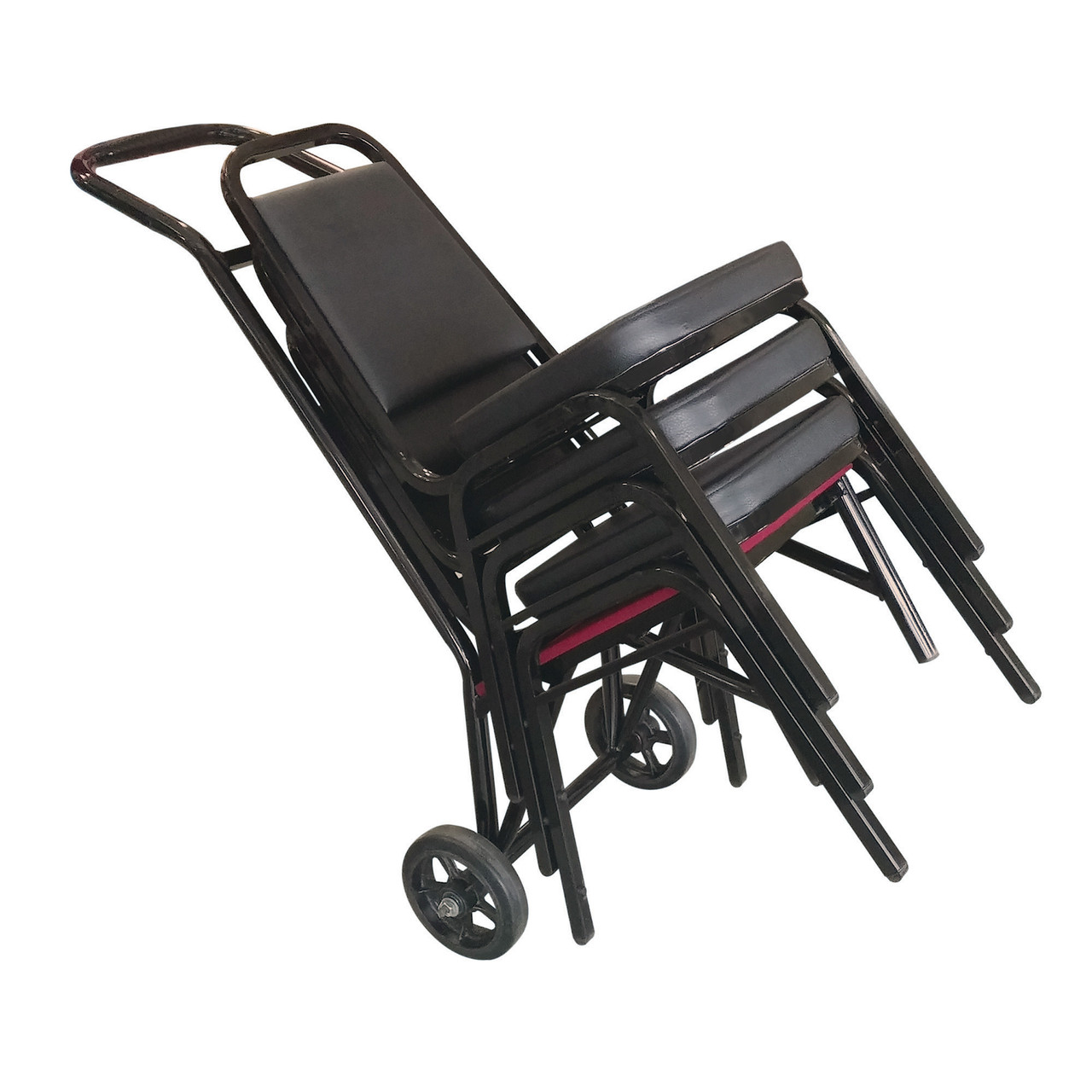 Move your stack or banquet chairs with ease by using this heavy duty dolly from Holland Bar Stool Company. This commercial grade dolly is capable of moving 12 stack chairs at a single time. All joints feature solid welds for maximum strength, and the frame is finished with a durable black powder coat. The 8” wheels have a steel rim with a hard rubber tire so they are strong yet safe on all floor types. Each wheel spins with ease thanks to the sealed ball bearing axle. Save time and, more importantly, your back, with this stack chair dolly from Holland Bar Stool!