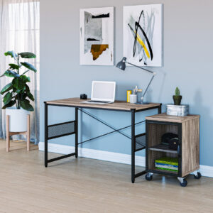 The distressed wood laminate top creates a reclaimed aesthetic. Two shelves with a pencil drawer giving one added space and organzation. Heavy Duty locking casters on wheels for extra security. Black metal mesh doors create partial privacy.