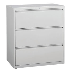 This 30 in. wide 3 drawer commercial grade lateral filing cabinet is designed for heavy duty use, yet looks great in any office. Precision ball-bearing suspension allows for quiet use in your busy office environment. Fully assembled steel construction with reinforced base. Non-porous surface is easy to clean and disinfect. Interlock system prevents tipping by only allowing one drawer open at a time. Dual lock bars and core-removable lock come standard. Unit includes hang rails, magnetic label holders, and four adjustable leveling glides. Greenguard Gold certified for indoor air quality. Meets or exceeds ANSI/BIFMA standards. TAA compliant. Limited Lifetime Warranty.