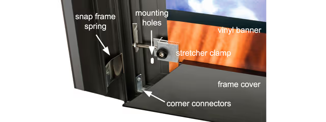 This banner grip frame uses tightly clasping, toothed stretch clamps to hold large-format graphics taut, preventing wind inflation, wrinkling, and tearing in both indoor and outdoor installations. Snap-edge covers conceal all mounting hardware for a seamless, professional appearance while allowing the frame to be installed once and reused with successive same-size prints. Its durable construction supports vinyl, canvas, metal, or plastic signage in portrait or landscape orientations. The system includes pre-built frame sections, corner hardware, stretch clamps, and wall-mount fasteners. Designed for long-term reliability, this banner grip frame provides a clean, low-maintenance solution for displaying large-scale graphics.
