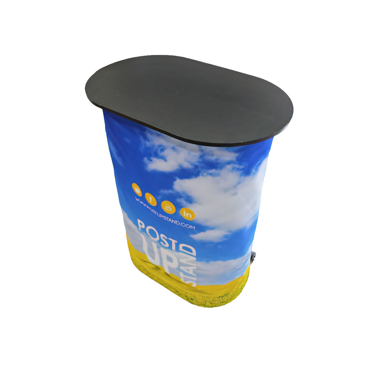 Add precious countertop space inside your trade show or college fair booth with the oval display with countertop! The low-cost package includes a promotional counter, which doubles as a display shipping container, and a full-color printed fabric podium wrap. Save money by purchasing this special package deal and receive a complete promotional counter kit that can complete any exhibit space!
