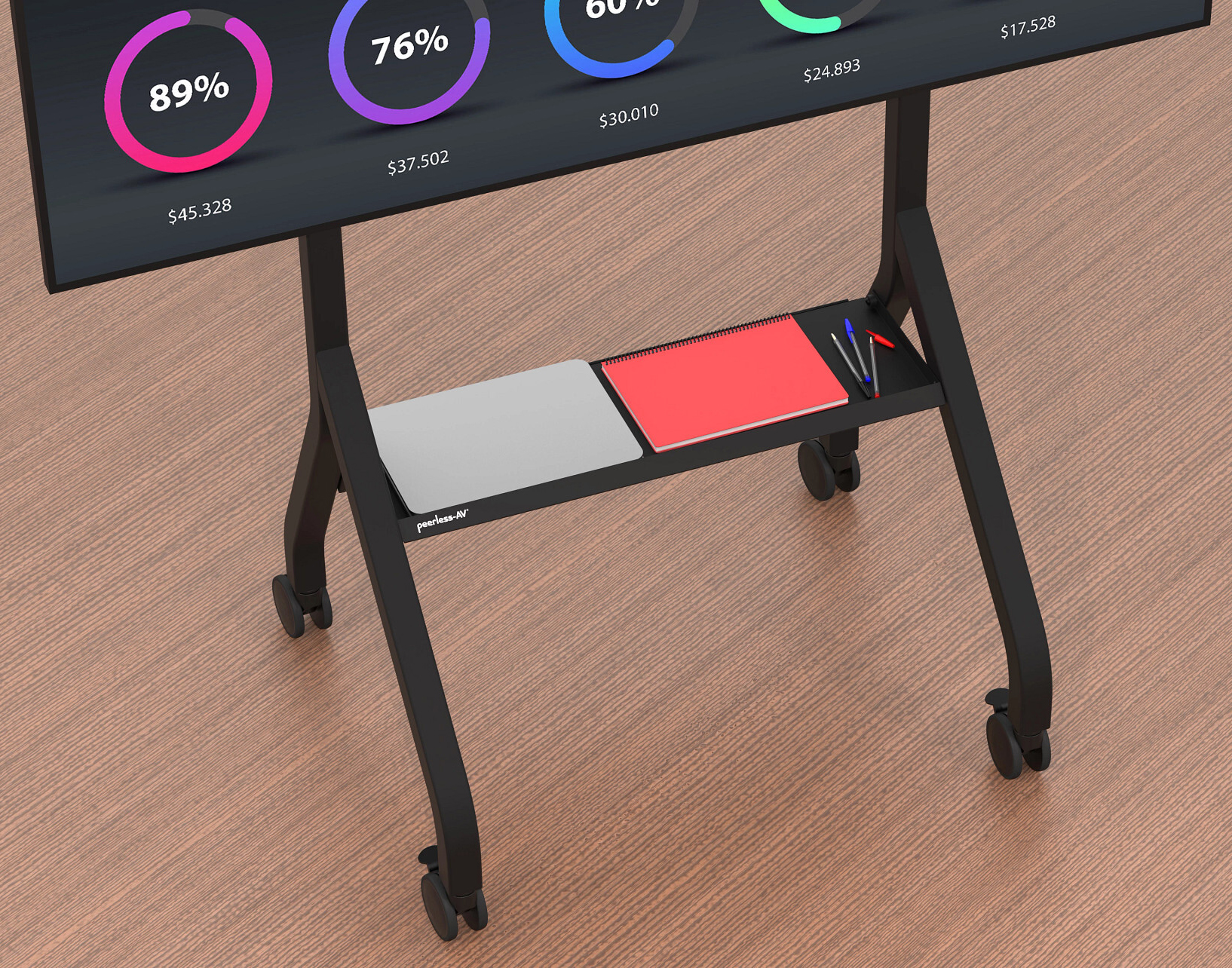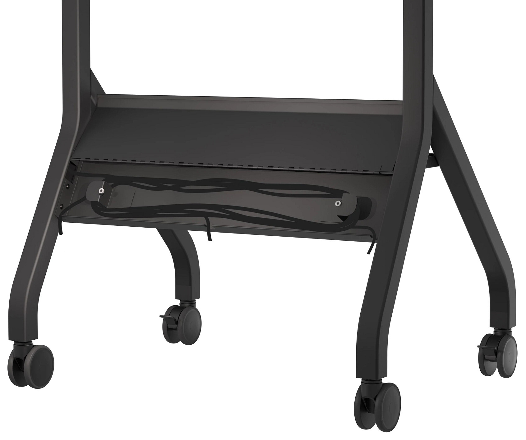 Need a professional, mobile way to showcase a large screen without committing to a permanent installation? The SmartMount® rolling flat panel tv cart is designed to support 55″–110″ displays with a robust 300 lb load capacity, delivering a reliable, height adjustable solution that adapts easily to different rooms and audiences. Built to handle large, heavy screens with confidence, this mobile cart allows your display to move where it’s needed most, whether that’s for presentations, meetings, or collaborative sessions, while maintaining a clean, polished appearance. Engineered for daily use, the cart features smooth-rolling locking casters for easy mobility and secure placement, along with integrated cable management to keep power and AV connections organized. An included shelf provides space for supporting equipment, helping maintain a streamlined setup around the screen. Durable construction and thoughtful design make this rolling flat panel tv cart a practical choice for organizations that value flexibility, professional presentation, and dependable performance in a mobile display solution.