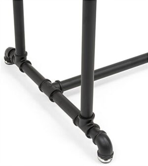 This double rail pipe clothing rack will certainly be an eye grabber in your retail store with its height and industrial appeal. At the end of each hanging bar are rounded knobs for a decorative appearance that also keeps merchandise from falling to the floor. The industrial pipe clothing rack touts a matte black, powder coated finish. The top bars are 18” apart, enabling you to utilize this fixture as a 2-sided centerpiece in any department of your retail store. On the base of the clothing rack are black rubber feet to prevent scratching your floor and to keep the fixture stable. Upgrade your décor with this functional and stylish retail display unit!
