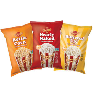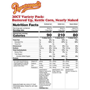 - Variety pack: 12-Nearly Naked Popcorn (0.55 oz), 9-Buttered Up! Popcorn (0.55 oz), 9-Kettle Corn Popcorn (1.5 oz)