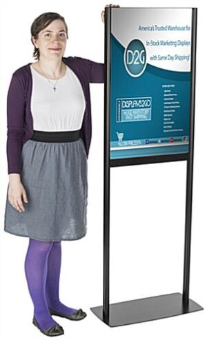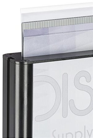 This adjustable poster stand is a great way to frame your graphics, even in the busiest of stores and venues. Double sided with PVC lenses and a center panel, this floor standing sign holder protects your graphics from light damage and maintains a crisp display. No matter how tall or short your graphics are, this height modifiable poster stand can accommodate any print with a width of 19″ and a height of your choosing. With a box cutter, you can easily cut the included PVC lenses to the ideal size for your needs. The aluminum frame and steel base of this sign holder are sturdy enough for multiple uses and years to come, from a crowded trade show floor to a fast paced retail store.This poster stand is an ideal display method if you desire size customization for your signage frames.