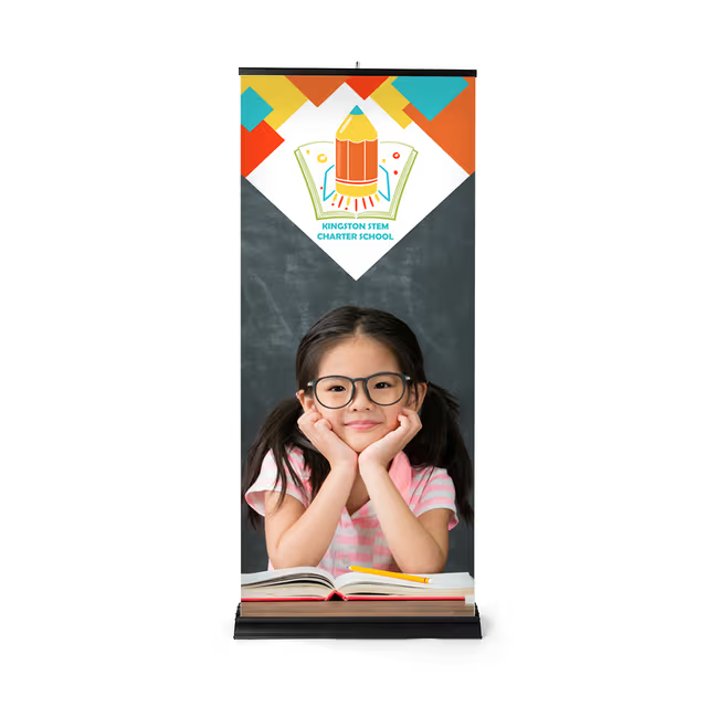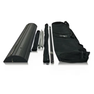 Effortless assembly and a lightweight, collapsible frame highlight this versatile and sturdy advertising display. Our premium roll up banner stands are printed on a durable vinyl material to make your exhibit pop with a full color graphic featuring your custom artwork. The premium retractable banner stand features a solid aluminum base (in silver or black) that provides a stable, solid aluminum footing for an 80” height custom graphic print. Ideal for trade shows, company events, storefront presentations, point-of-purchase displays, college fairs or community functions, the wide base retractable banner stand is a long-lasting marketing solution that can be used event after event. The innovative retractable nature of the stand allows you to simply pull the poster up from the base and connect to the vertical support bar that sits in the base of the unit. With a retractable banner stand, you cut down on the valuable time it takes to set up your display at your event, making set up and take down of your trade show booth or company space stress-free. The premium retractable pull up banner is portable with a canvas tote bag that is included with your purchase. Add polish to your brand with customizable end caps to complete the look, available in black, blue, or green.