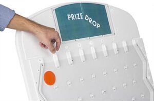 Built with customizable graphics and white LEDs, this lighted prize drop board is ideal for any event. Auction off products, cash, discounts, or other items using the eight card slots found at the bottom of the game. Each white prize drop board comes with everything you need to start playing including, three orange pucks, and batteries to power the colorful LEDs. Six different modes offer varying flashing styles to grab the attention of customers and passersby. Templates can be downloaded below and edited on any computer to allow you to change game graphics whenever necessary. Bring this prize drop board to your next event to distribute promotional products and other fun items!