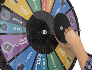 With flashing white lights and custom prize cards, this LED contest wheel is the attention-getting display you’ve been looking for. Built for tabletops, each unit measures 31” in diameter and includes 3 removable center plate stickers for an eye-catching fixture. This black contest wheel comes with downloadable templates, which can be found below, to easily create and cut your own graphics right at home. The clicker makes twenty-four clicks per rotation and makes a fun noise that will attract people from the surrounding area. White flashing lights catch your eye while your custom graphics and prizes will keep the spotlight on your business. Get a contest wheel for your next event as a fun way to meet new customers.
