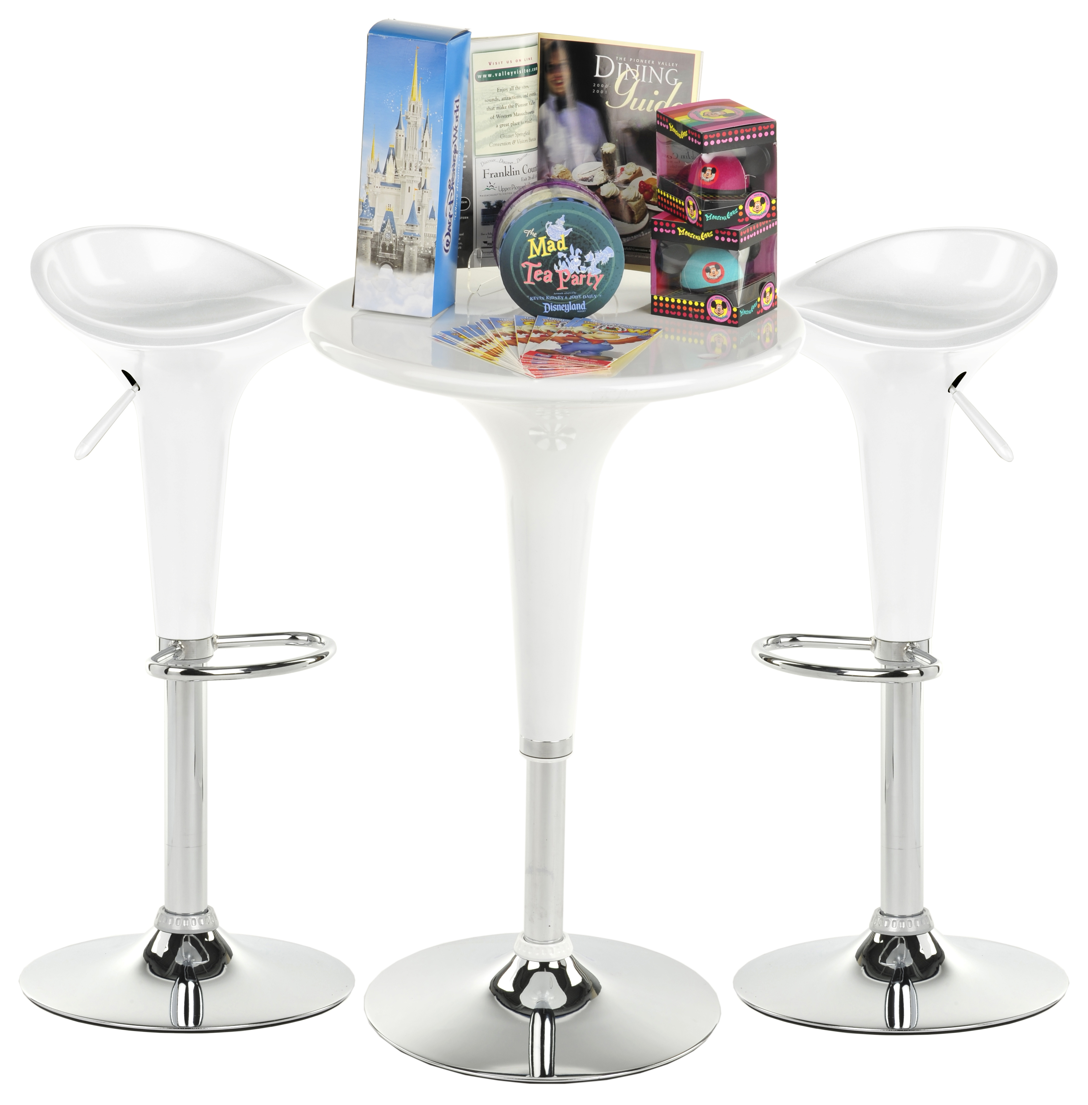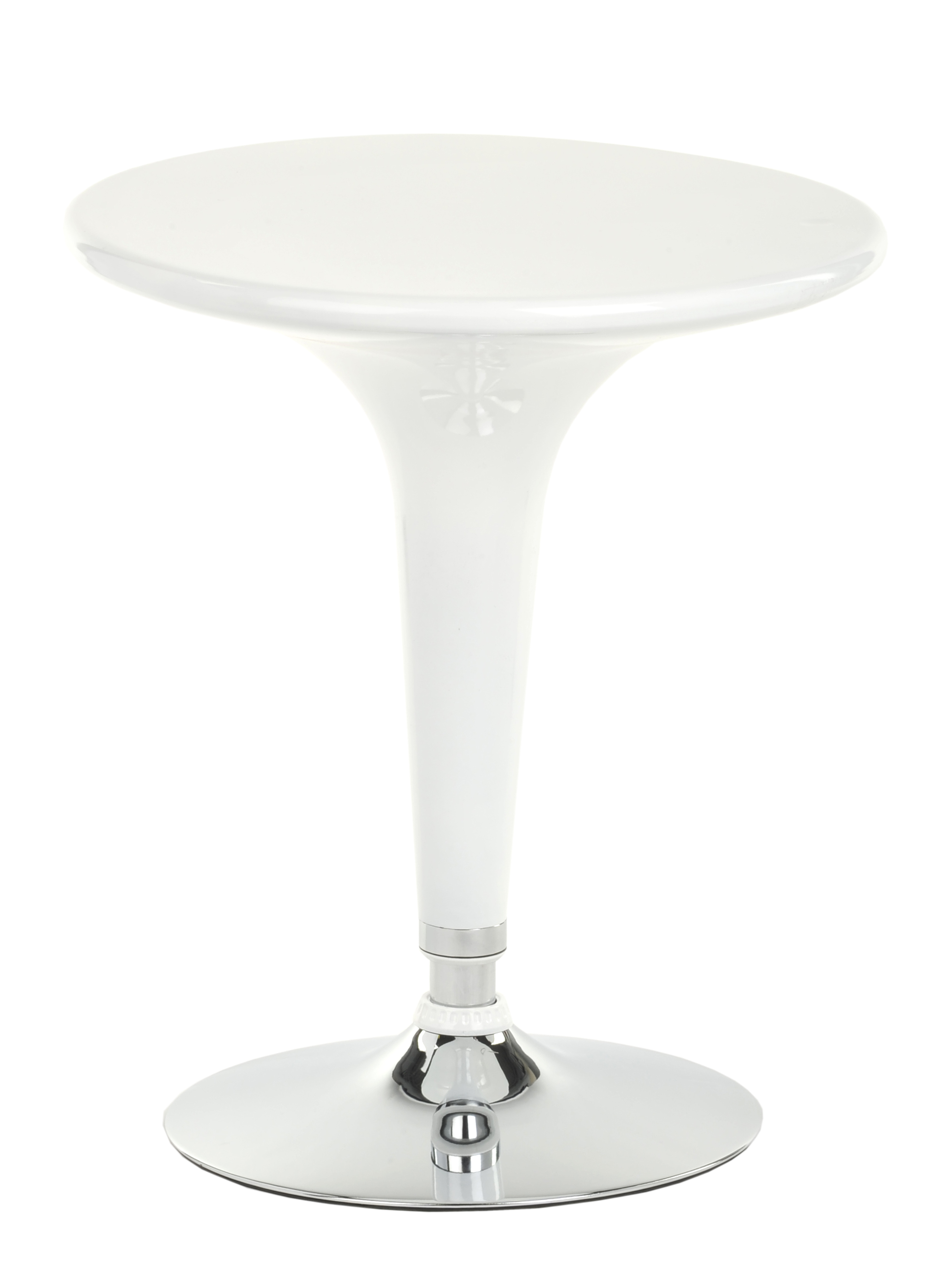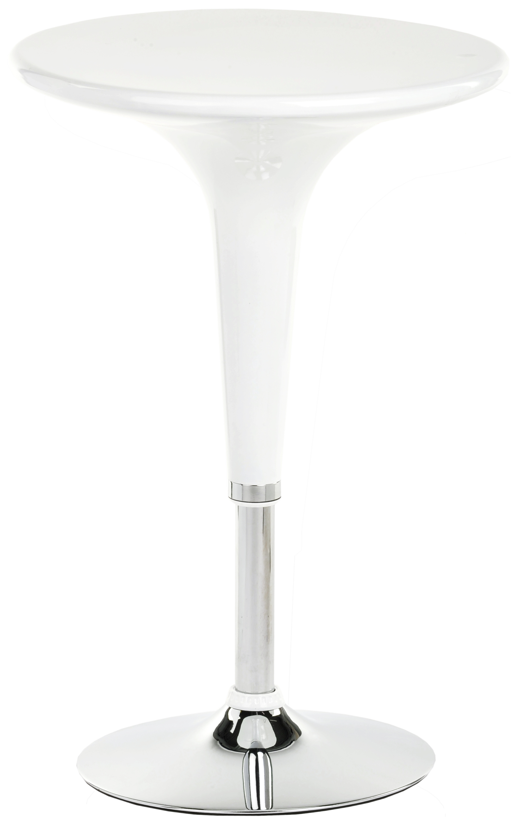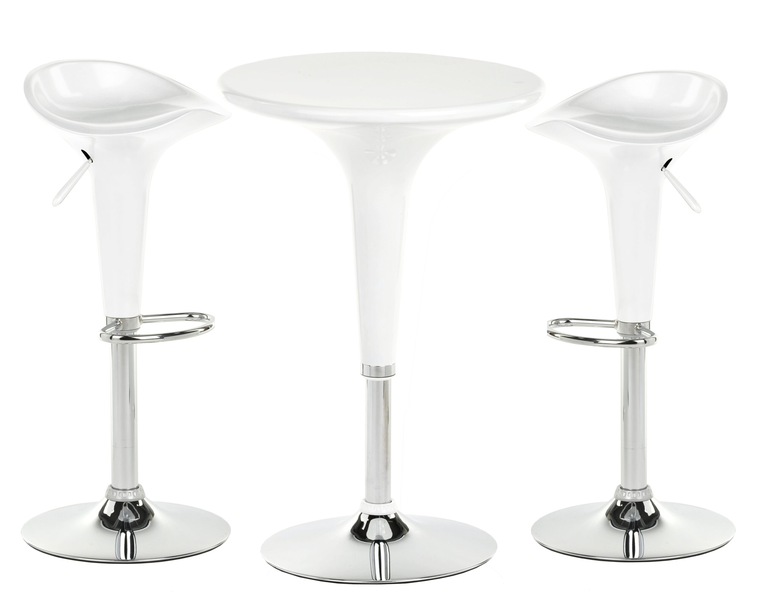 This trade show table and stool set comes with 1 round tabletop and 2 pub seats. Manufactured from white ABS plastic and chrome-plated metal, the overall presentation exudes modern and contemporary style. All three pieces are height-adjustable via pneumatic lifts and the two chairs also rotate. Easily adjust the pub furniture from seated to bar height, depending on changing needs. Both chairs feature footrests for the ultimate in comfort. Display our seating set in your trade show booth, reception area, or trendy restaurant or lounge environment!