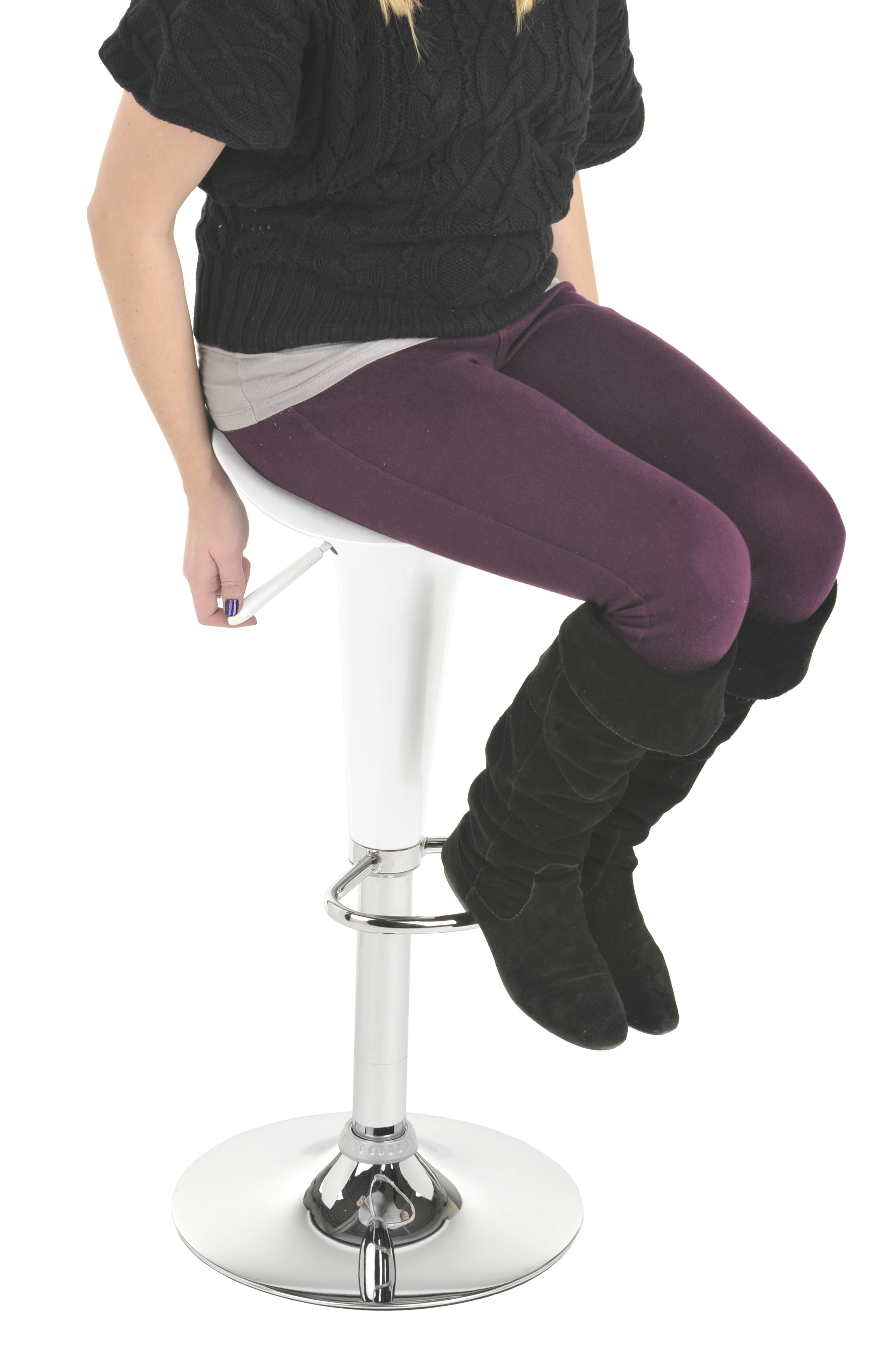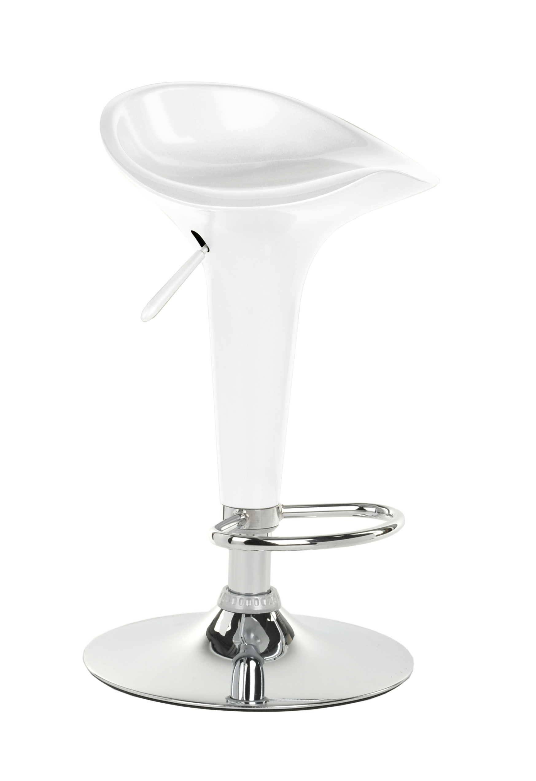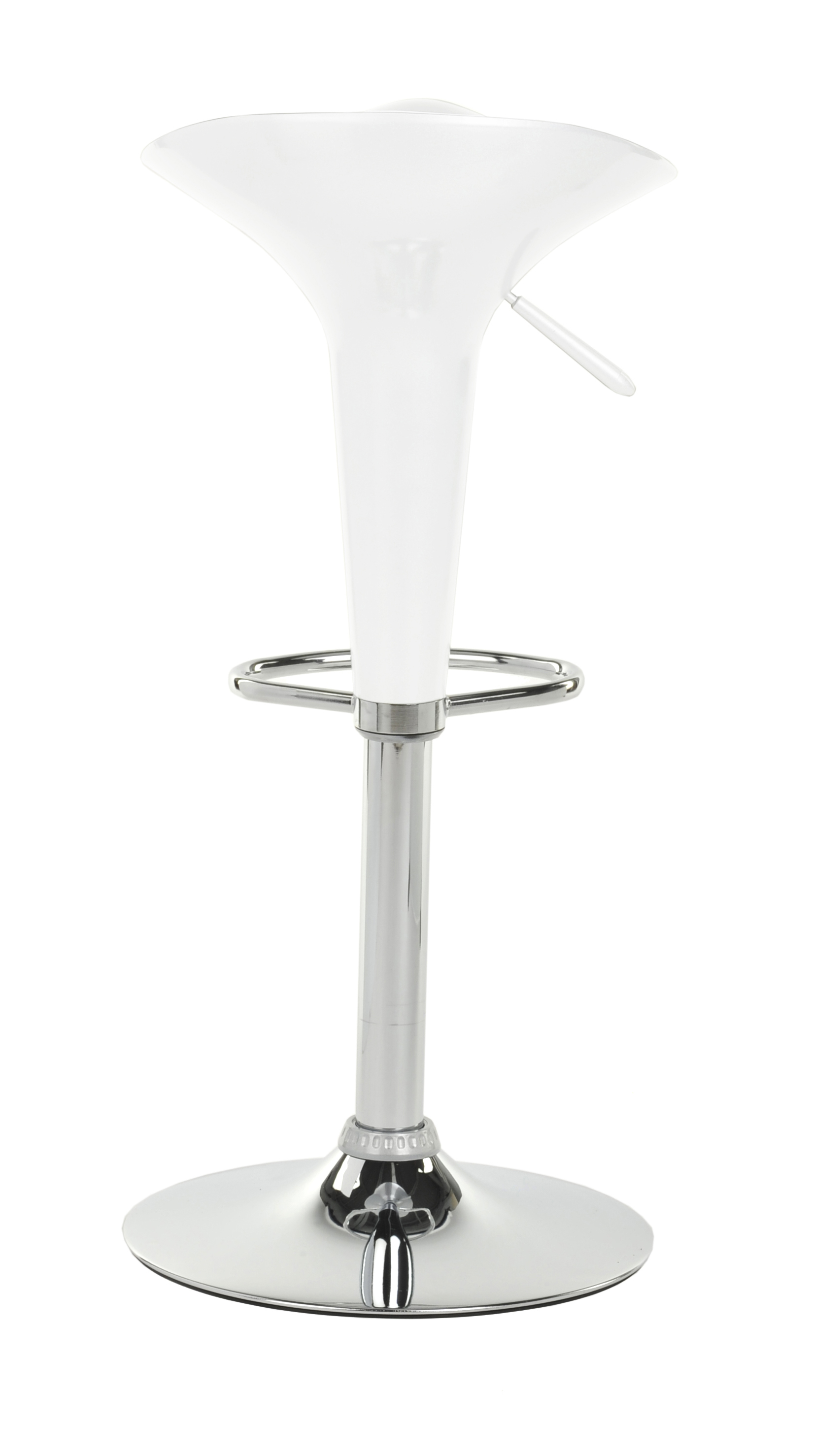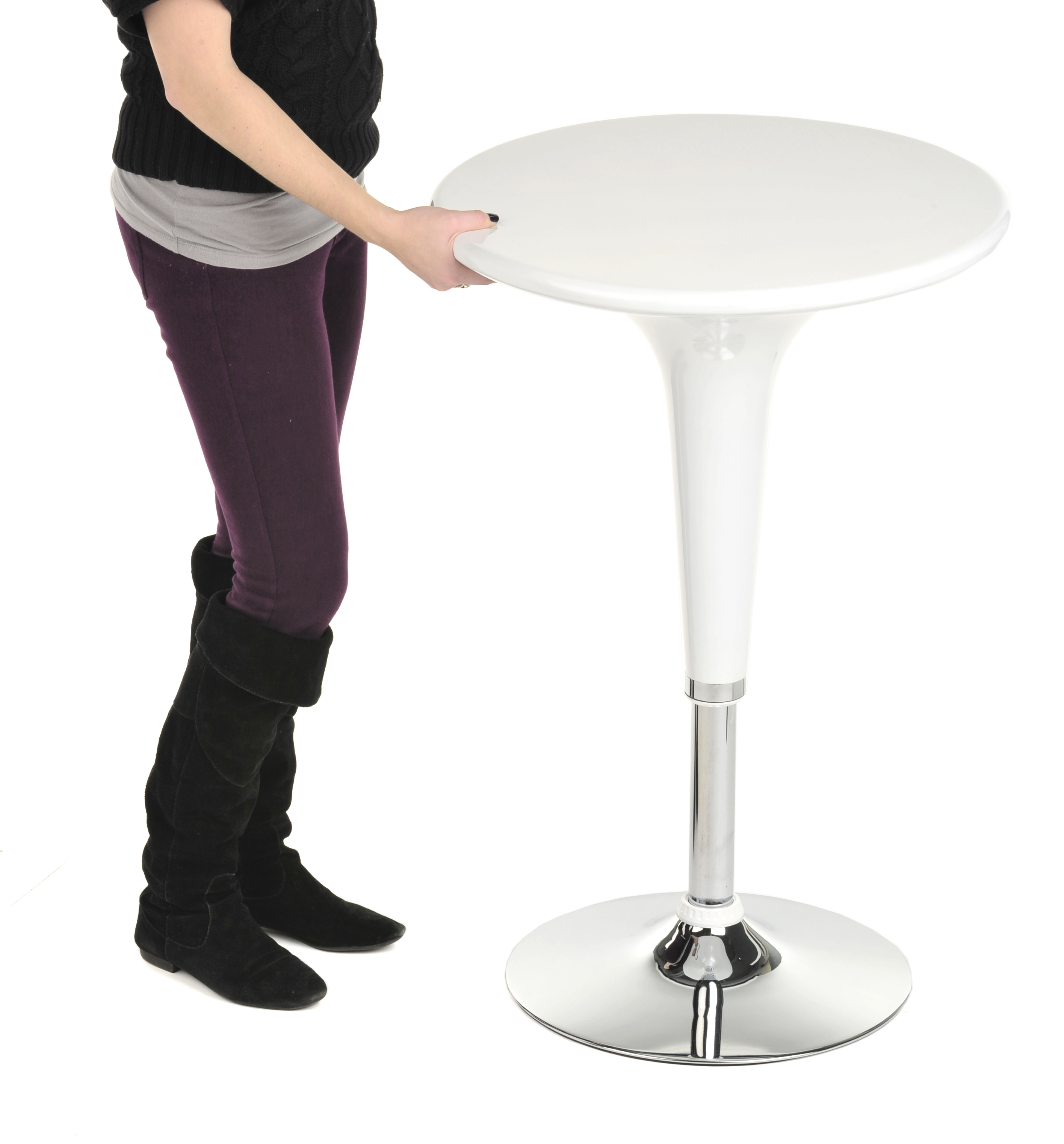 This trade show table and stool set comes with 1 round tabletop and 2 pub seats. Manufactured from white ABS plastic and chrome-plated metal, the overall presentation exudes modern and contemporary style. All three pieces are height-adjustable via pneumatic lifts and the two chairs also rotate. Easily adjust the pub furniture from seated to bar height, depending on changing needs. Both chairs feature footrests for the ultimate in comfort. Display our seating set in your trade show booth, reception area, or trendy restaurant or lounge environment!