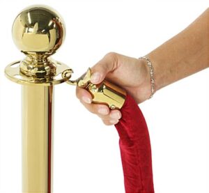 - Upscale rounded-top design features polished brass-finish stanchion posts (titanium-coated stainless steel construction) and burgundy velvet hanging rope; provides an upscale means of crowd control, line queuing or display protection