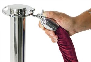 - Modern flat-top rope barrier design features a polished chrome-finish post (mirror-finish stainless steel construction) and burgundy velvet hanging rope with chrome hooks; provides an upscale means of crowd control, queue management or display protection