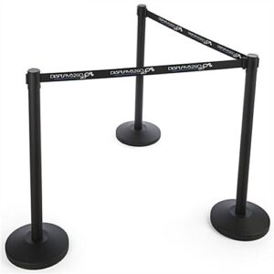 This stanchion with black printed belt measuring over 6’ in length provides ample surface area for 2 color silkscreened graphics. Highlight your logo with a retractable barrier that is entirely customizable and available with single or double sided embellishments. Design messages and graphics to showcase on the nylon band wound within the cartridge which affixes to the top of each steel post custom stanchion. Finished with powder coating, these economical crowd control barriers are durable and will coordinate with any environment. Assembly is easy, simply screw the stanchion posts into the rubber bottom weighted bases and finish off the units by sliding on the cartridge and securing with screws. Utilize these creative and custom 4-way belt receiver to configure lines, barriers or dividers however best suited for your crowd control floor plan.