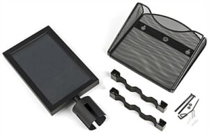 This stanchion with 2 literature pockets and sign holder has a blue belt that is retractable provides easy access for employees and staff. Extending 6.5 feet in length, the band allows for a variety of configurations to be created. Each retractable stanchion stands 41.5” tall and has a weighted base for stability. The neutral black finish looks appropriate in any setting, from trade shows to bank queues. Utilize the accessories kit that comes with each stanchion for versatility. Included in this bundle is a double-sided topper that holds 7” x 11” signage, and two holders for informational catalogs or brochures. The kit allows users to advertise their event while providing attendees with easy access to promotional material. The accessories have a matching black finish for a polished, professional look.