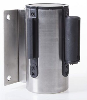 A wall mounted retractable barrier features a black adjustable belt. This mount can extend past 7’ long. Each wall mounted barrier, with a black retractable belt, can be pulled from 0” to 7’-2”. Create a crowd control line with these stainless steel stanchions. This wall mounted retractable barrier that can mount in a business, is designed with quality materials. The stainless steel mount is designed to last. A wall mounted retractable barrier, for crowd control, is brushed satin. The design will complement a variety of settings.