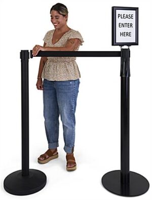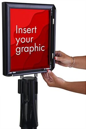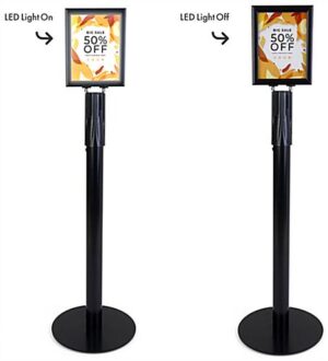 This stanchion with LED sign holder is double-sided, so you can print and display a variety of 8.5″ x 11″ ads, promotions, and events in corporate offices, shopping centers, concession stands, and more. The sleek black barrier includes one retractable belt and three belt receivers to link to other Queue.Pole Economy or Value posts. Our double-sided stanchion with LED sign holder has a snap frame that opens on both sides, making it effortless to apply your 8.5” x 11” graphics. To assemble, simply place the topper onto the barrier, guided by the + & – stickers on the pole and lightbox. This crowd control stand ships with a pre-installed rechargeable battery that will last for 6-7 hours of consistent use and can quickly be plugged into a wall when needing to be charged. The illuminated panels on the snap frame are excellent for events that take place at night, such as concerts, sporting events, and more. Use this modern stanchion with LED sign holder to not only maintain efficient crowd control but to create eye-catching advertising content in stadiums, event venues, retail stores, offices, and more.
