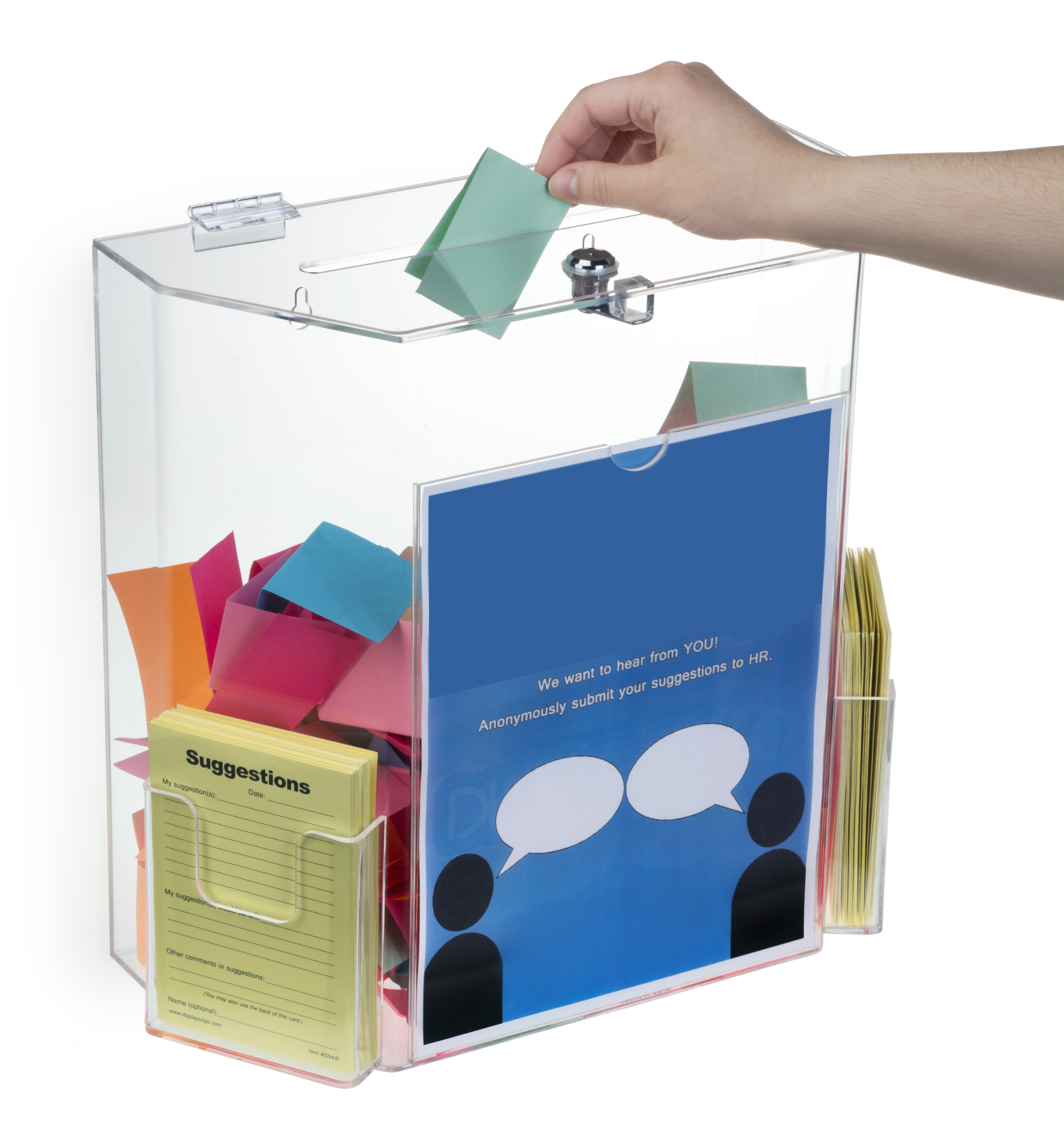 This recycled acrylic suggestion box with brochure pockets has a hinged top with a 9” long slot and key lock. This unit is designed using fully recycled material to help your organization meet its sustainability goals. Pre-drilled holes allow the holder to be mounted to a counter or wall. Each suggestion box with lock is entirely transparent, allowing participants to monitor the contents of the container. The recycled acrylic holder is great for donation collections, raffle tickets, anonymous feedback, and more! Users can easily print and display their graphics using the 8.5” x 11” sign frame at the front of each unit. A suggestion box is great for boosting business morale. Our recycled acrylic holder can be used for inter-office raffle competitions, charity collections, and more.