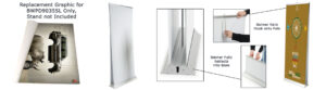 These vinyl banners, also known as replacement signs, have enough price points that it makes far more sense to purchase a newly designed graphic from this site, instead of a local print shop. From the comfort of your computer, a newly designed sign can be submitted following the artwork template link below. These vinyl banners that are easy to install are fully compatible with your previously purchased stand, and will be ready to install the moment they are received. From the time customers’ artwork design is approved, the graphic ships within four days. These vinyl banners will not only help make an advertising campaign effective, but help businesses keep their advertising costs low as well!