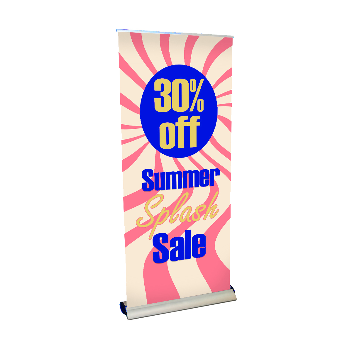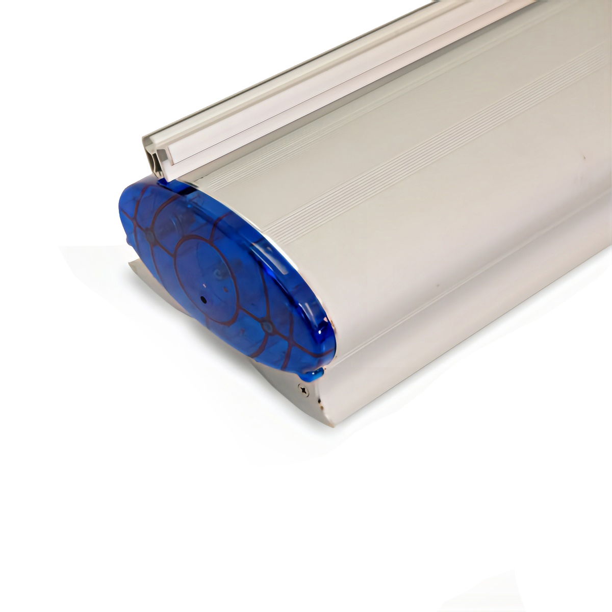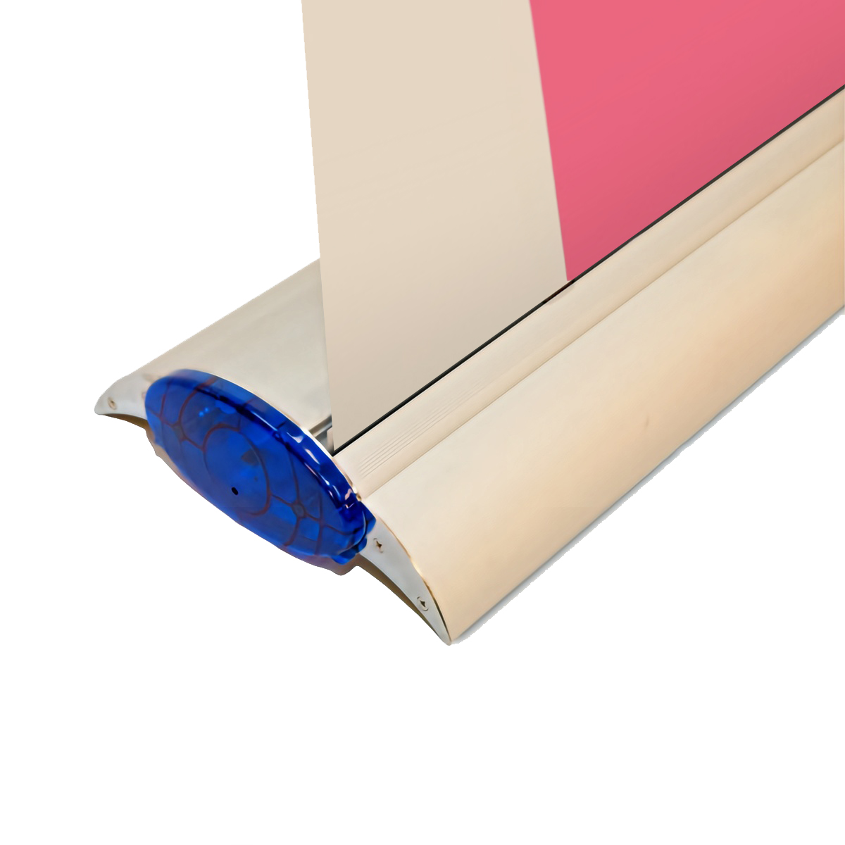 Create a sleek and stylish exhibit space at a trade show, college fair, or in-store promotion with the modern Silver Wing Retractable Display. The attention-grabbing retractable frame features a base that is stabilized by curved aluminum flaps that unfold from the underside of the base in the front and back. This creates a chic curved display frame that can stylishly showcase your special message on a 33″W x 83″H banner. Custom full-color graphics are included in the purchase and are produced by a high-quality large format digital printer for crisp and vibrant printed output. With a user-friendly retractable design, simply pull the banner upwards from the base and attach to the sectioned vertical support bar to display your custom marketing message in mere seconds! Circular blue end caps are included on either side of the aluminum base to feature a splash of color on the hardware. The lightweight banner display only weighs 15 lbs. so it is a breeze to take with you to each business convention, presentation or special function.