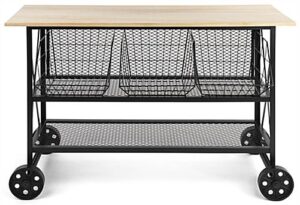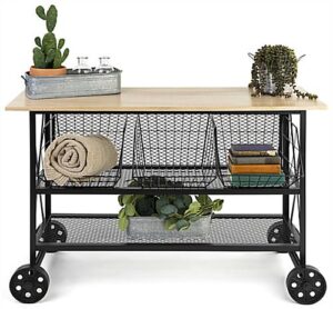 This industrial wood and mesh display console measures 47.25″ W x 16.5″ D x 32″ H and has a rustic flair, combining warm oak wood and black iron to create a contemporary retail fixture for your boutique, country store, gift shop, garden center or home décor showroom. This rolling cart has four non-locking metal wheels, allowing you to move it around your home or business with ease. Each rustic industrial wood and mesh display console comes with three black iron grid dump bins that are perfect for storing merchandise and products. If you need less storage, the baskets nest together and can be put away in exchange for more shelf space. This versatile rolling cart retail fixture will beautifully showcase your plants, candles, home decor items, clothing, accessories, and more uniquely and stylishly. Our contemporary industrial wood and mesh display console pairs beautifully with the other items in our SMMM collection to provide you with a beautiful rustic flair in your home or business!