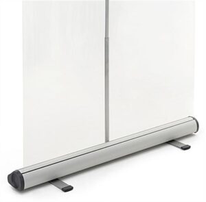 Our clear roller banner measures 47” wide by 90” tall, providing you with a large-scale physical distancing solution for your establishment. With its commanding size, this retractable cough and sneeze barrier offers maximum protection against harmful contaminants without obstructing the view of guests and employees during business transactions. Constructed with a flexible polyester panel, each clear roller banner with silver aluminum base is designed to safeguard individuals sitting or standing on opposing sides. This floor standing sneeze guard is easy to assemble and dissemble — perfect for temporary setups within gyms, hospitals, restaurants, hair salons, corporate offices, or any space that needs an added layer of safety. Each extra-wide retractable shield comes with a black nylon carrying case to easily transport or store away when it is no longer needed. Enforce social distancing within your business and provide the utmost protection for your employees and customers with our durable clear roller banner today!