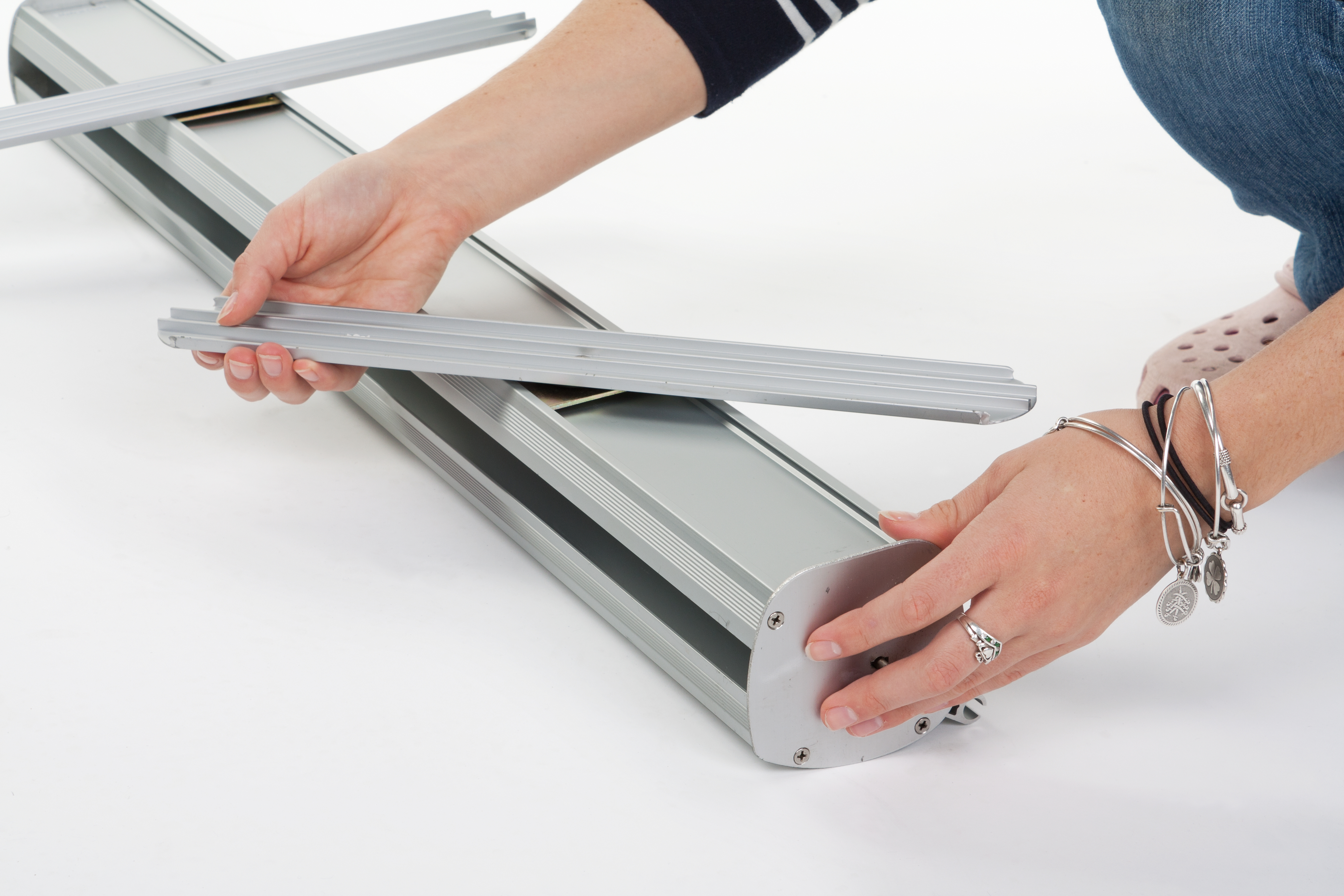 These roller banner stands are inexpensive, priced for any budget. The structure of these exhibition displays is made from aluminum weighing only 6 lbs. This feature alone already makes these roller banner stands that are lightweight desirable for any trade show exhibitor on the go! This product is built with convenience in mind. These indoor roller banner stands, also called pull-up advertisements, are an affordable way to promote your company, launching new products or services. Pull-up advertisement displays also offer a quicker setup. These roller banner stands that are portable are great for use during a variety of events, as each unit assembles in mere minutes! Roll-up advertisements can be displayed alone or in conjunction with other pop displays for an elaborate presentation. These trade show roller banner stands are great for use in any indoor location such as trade shows, lobbies, restaurants, retailers, meetings and business expos. Each unit features a self-winding rolling cartridge that is in a steel casing. These roller banner stands that have a roll-up mechanism retract graphics easily. When not in-use, graphics will be protected inside a self-contained steel casing. This product is sold without graphics included. Customers are required to supply their own custom signs to put in the aluminum exhibition display. There is an adhesive strip along a plastic sheet in the base. The graphic is adheres to the strip and is placed inside the hinged clamp at the top of the unit. For that reason, these exhibition displays are not meant for replacement graphics. There is no additional hardware required to set up these pull-up banners. The entire unit can be set up within minutes! Therefore, this pop-up poster display is perfect for use during conventions and exhibitions.