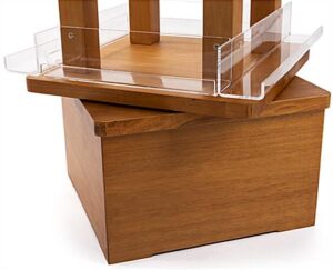 Use our four-sided revolving wood literature rack to grant customers maximum product visibility at any angle. This floor standing spinner display is made with a solid oak wood frame giving it an earthy elegance that blends into both rustic and modern retail spaces. Ideal for boutiques, gift shops, or greeting card stores, this revolving wood literature rack holds an ample amount of merchandise while taking up minimal space on your selling floor. Each four-sided rotating fixture features 28 durable clear acrylic shelves with 3/16″ thickness that hold up to five pounds per shelf. Designed with full 360-degree swivel rotation, our revolving wood literature rack offers patrons an unobstructed view of showcased products like books, 5″ x 7″ vertical or horizontal greeting cards, art prints, and more. The clear acrylic shelves on this floor standing carosuel come with a raised ledge that keeps items securely perched in place while guests spin this fixture. Arrange your best merchandise on this revolving wood literature rack to create an eye-catching display for guests to browse through with ease.