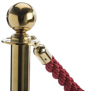 This line control rope is part of a brass barrier system used for crowds. For multi-configurations each stanchion post has a 4-way adapter. Each end of the twisted red rope has a polished brass hook. Simply clip the cable to the top adapter for a quick assembly. The rope is 78” long, which sets each stanchion post 6ft apart for the crowd system. Brass hook ends provide a high end look. To prevent floor damage the bases are rubberized.