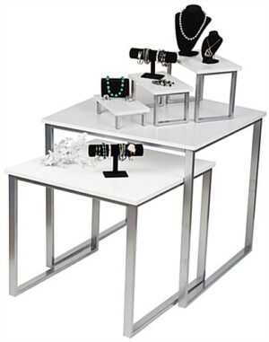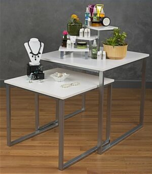 This display tables and risers set features a contemporary design that looks great in retail settings! Included with the purchase are three nesting tabletop store fixtures and two large floor standing units. Because the retail table set is stackable, they serve as a great way to save space when not in use! The furniture is crafted from a silver powder coated frame and a semi-gloss white melamine tabletop, which complements a wide variety of décors. Anti-slip padding on the table set framing keeps it stable and prevents scratched flooring. Use the store fixtures in different spaces of the space for a wide variety of merchandise, or pair all of the units together for a harmonious furniture appearance!