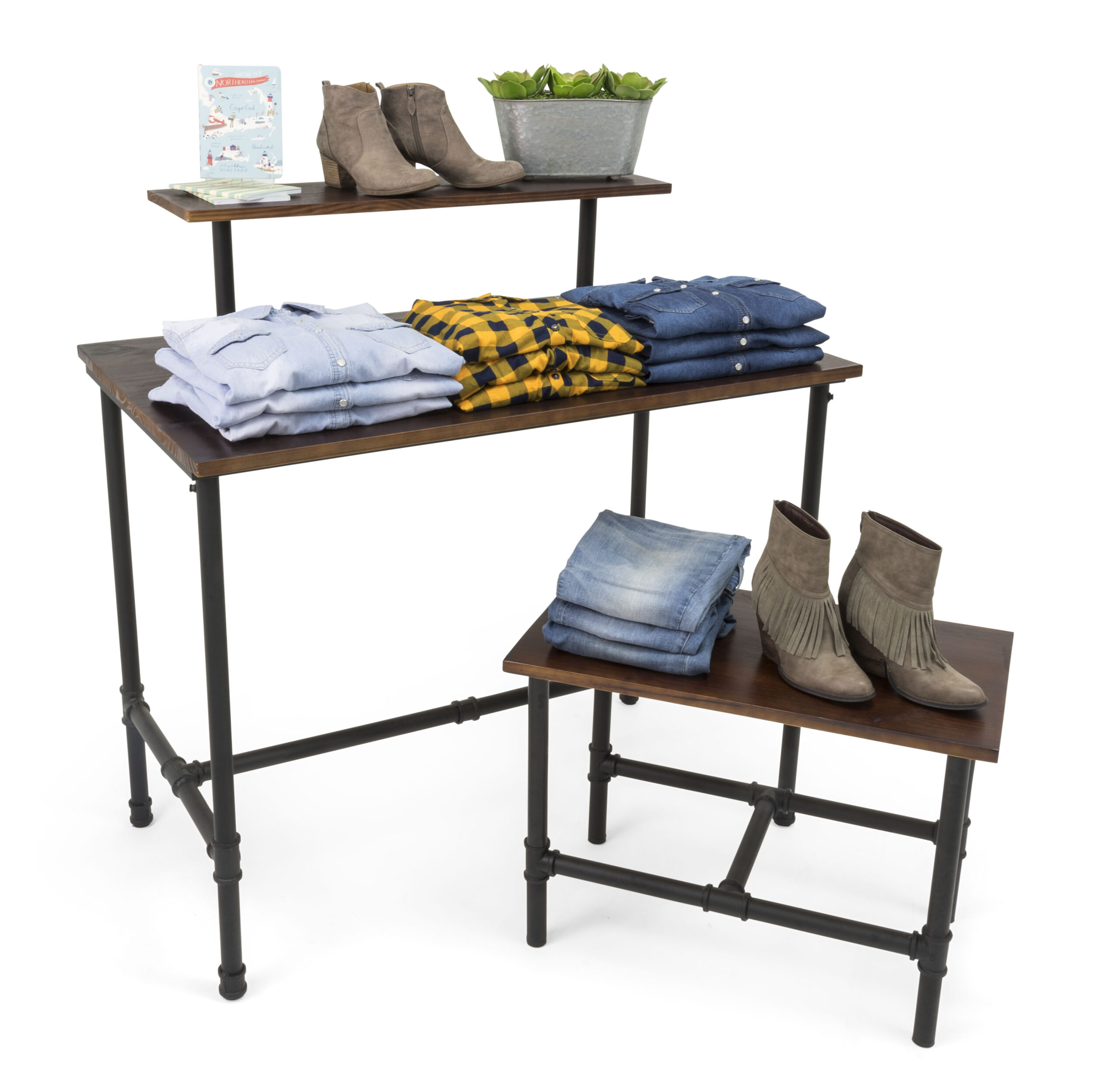 This set of pipe display nesting tables are the industrial fixtures you’ve been looking for to feature specific lines of jeans, shorts, shirts and shoes. The dark brown stain on the unit complements the black base. The smooth pine wood pipe display nesting table features pre-drilled holes for a quick setup with the industrial piping framework. Included is a dark brown, 10” tall shelf that can be screwed into the larger fixture to show off the smaller, matching accessories. With rubber grippers on the base of each leg, you can be sure the nesting tables will remain stable and not damage your sales floor. All hardware is included along with a screwdriver to be sure you have everything you need to have your unit assembled are ready to showcase your apparel.