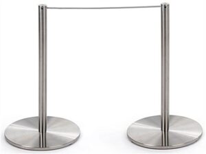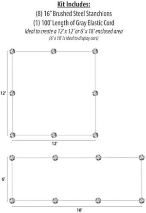 This 8-barrier silver low profile stanchion set was designed to create custom, modern barricades for all sized exhibits. Use all eight posts and 100 feet of elastic rope together to section off an 18’ x 6’ area around classic automobiles or cut the cord for smaller artwork safety borders. This contemporary low profile stanchion set is only 16” high to ensure patrons’ views are unimpeded while touring your gallery. The build consists of stainless steel posts accompanied by a latex and textile polyester cord for a sturdy and elegant crowd control system. This kit can easily be assembled to accommodate either large pieces or customize for smaller sections by cutting the rope and using fewer poles. Create your desired display section by simply unscrewing the cap of the posts, tying off the line, and screwing the top back in place for a hidden knot and secure cord. This stanchion set is the ideal contemporary crowd control unit for showcasing artwork, cars, and more while ensuring an unobtrusive safety border for products.
