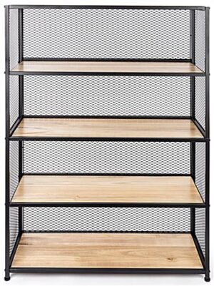 This mesh wood bookcase shelving unit has a rustic modern design with the light oak wood shelves and the black powder-coated iron elements. With overall dimensions of 40″ W x 16″ D x 60″ H, this contemporary retail display is perfect for boutiques, home décor stores, gift shops, bookstores, and more. This rustic modern mesh wood bookcase shelving has the netted side panels allowing you to use the S hooks (SM50SH) we sell separately to hang bags, accessories, and more to expand your showcase space. Each 0.75″ thick solid light oak shelf measures 38″ L x 15.75″ W and has a max weight capacity of 33 pounds each, allowing for flexibility in your retail product displays. This contemporary unit is simple to assemble with all necessary hardware included to do so with ease. Pair this modern mesh wood bookcase shelving with other fixtures from our SMMM retail collection for a complete showcase that will genuinely elevate your gift shop’s overall aesthetic, market, or home decor store!