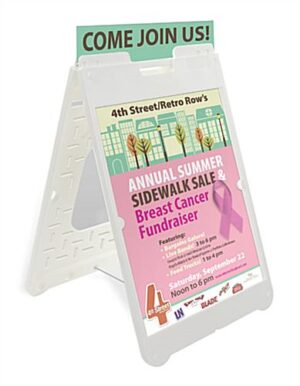 The outdoor signage display is a very cost effective way to advertise! These outside signs are made exclusively from polyethylene. The completely plastic construction this outdoor signage features is rust and splinter proof. You may place these business signs outside your store without fear of weather damage to the display. The material ensures that the outdoor signage will stand up over time. These a-frame boards are easy to transport from one place to another. The outdoor signage has a lightweight design with a handle on top. In addition, the unit folds down quickly for carrying and stowing. The graphics display, outdoor signage is a cheap and effective way to attract new customers.